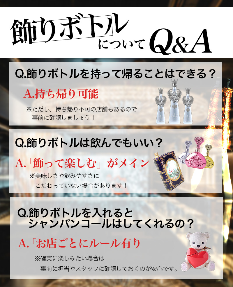 ここでは、そんな飾りボトルについての「よくある質問」をまとめました。基本を押さえておくことで、ホストクラブをより安心して楽しむことができますよ。