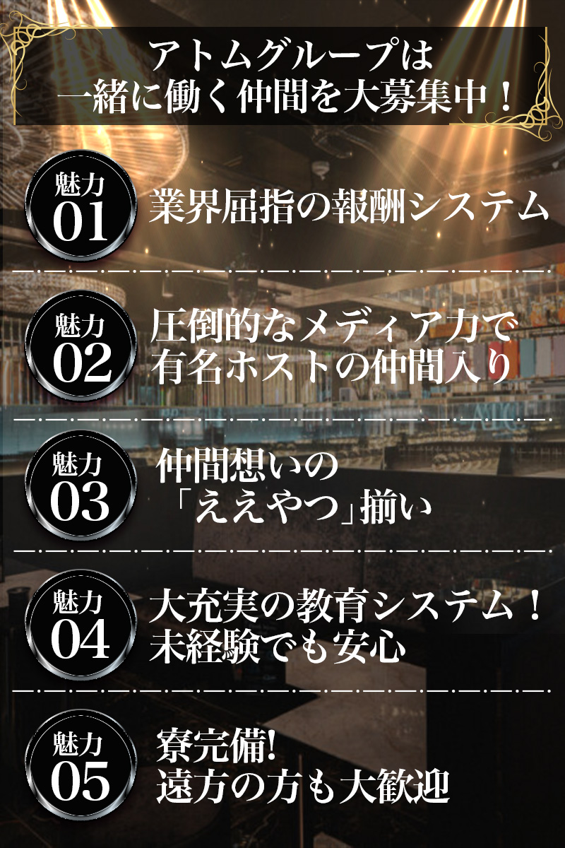 アトムグループは、大阪ミナミを拠点に、東京・新宿歌舞伎町や梅田、札幌すすきのなど全国へと展開している、業界屈指の知名度と人気を誇るホストクラブグループです。
